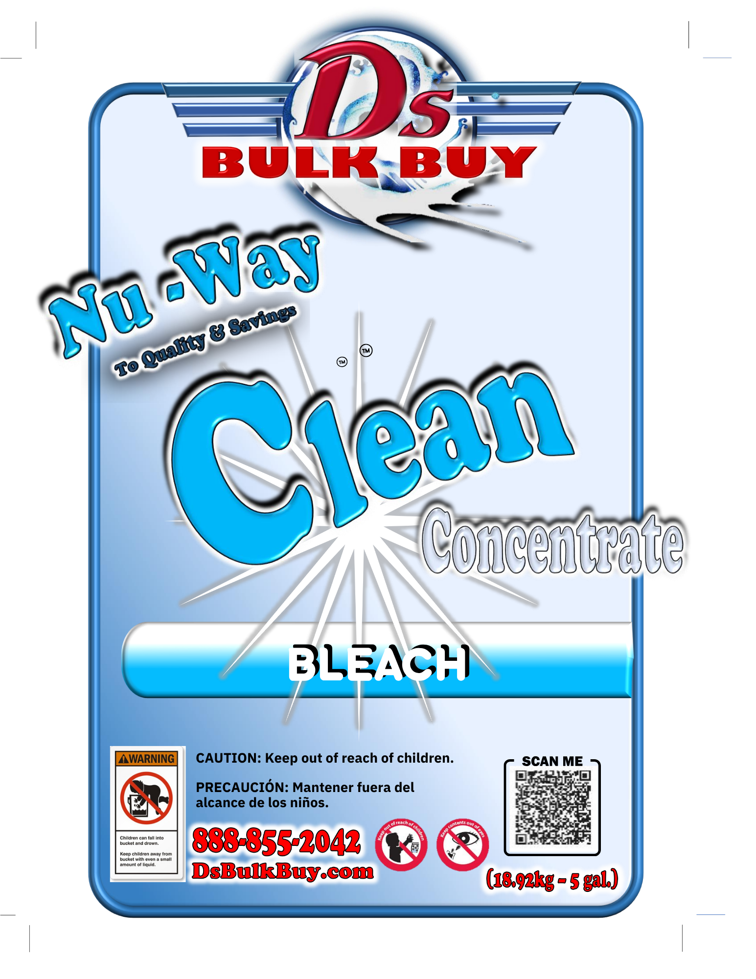 Nu-Way Clean Bleach™ is a concentrated formula engineered for maximum cleaning power and efficiency. This potent disinfectant cuts through tough stains, grease, and grime while eliminating 99.9% of bacteria and viruses. Ideal for commercial kitchens, healthcare facilities, and industrial settings, the concentrated composition means less product needed per application, reducing costs and environmental impact. Simply dilute according to surface requirements for versatile use on non-porous surfaces. Trust Nu-Way Clean Bleach™ for professional-grade sanitation that delivers consistent, reliable results every time.